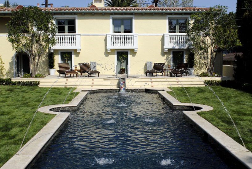 Award-winning Landscape Architect Cleo Baldon complimented the 24,000 sf property with an exterior plan that saves the original pool, while adding perfect horticulture and a new hardscape that is ideally matched to the fl ow and transition between home and grounds – from horse-headed arbor beams to dancing water elements.
