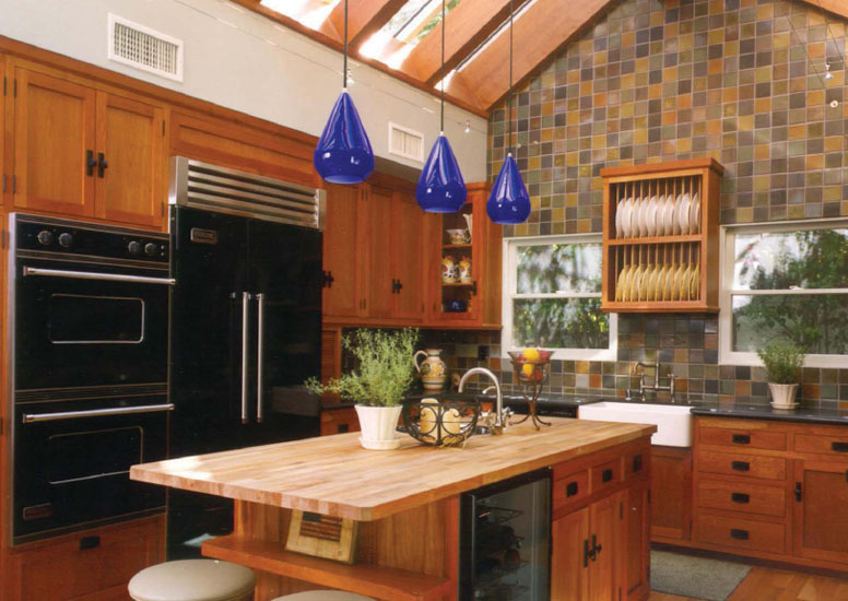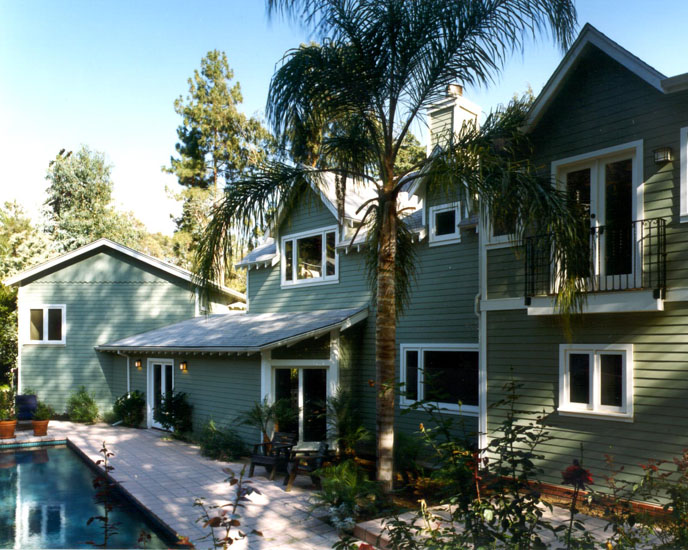 The challenge by architect Gus Duffy was to compliment the style of the existing one and two story house. The new Master bedroom/bathroom/study was designed to suspend over the existing first floor Living room, Dining room and Den while blending in architecturally. The Cherry Kitchen has an all-glass roof.